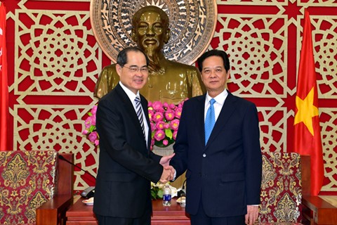 阮晋勇总理欢迎林勋强部长代表新加坡政府赴越出席宜安的越南新加坡工业园开工仪式;同时强调,越新战略伙伴关系过去以来良好发展。目前,新加坡成为越南大贸易伙伴、大投资国之一;新加坡在越南投资总额为330亿美元,2014年双向贸易额达100亿美元,2015年越新双向贸易额有望达110亿美元。