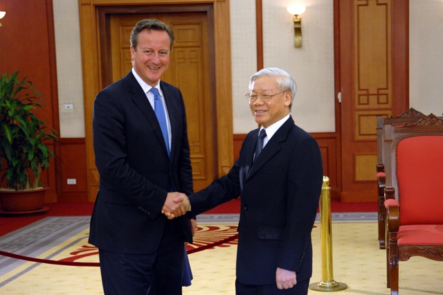 阮富仲总书记高度评价越英关系过去以来灵活发展,尤其是从2010年9月两国建立战略伙伴关系;并表示希望,卡梅伦首相这次访越之行将有助于增进两国相互了解,继续推进两国各领域的战略伙伴关系合作,其中包括越南共产党与英国各政党关系,两国经贸投资,教育合作活动。