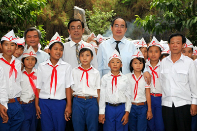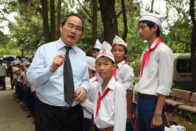 阮善仁副总理与广治省学生们在长山国家烈士陵园合影 图片:VGP |