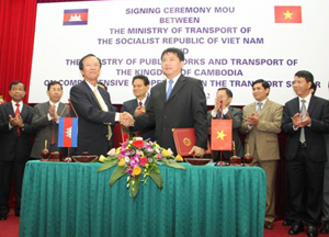 当日,越南交通运输部部长丁罗升与柬埔寨公共工程与运输部大臣陈尤德签署了越 - 柬交通运输全面合作协议。