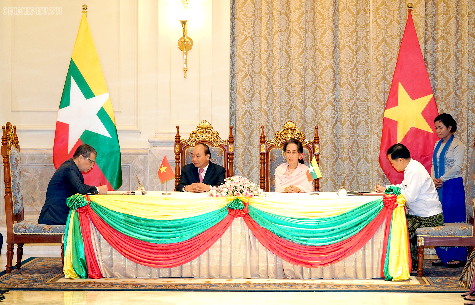 阮春福总理与缅甸国家顾问昂山素季见证越南与缅甸合作若干文件签署仪式——图片:VGP/光孝 |