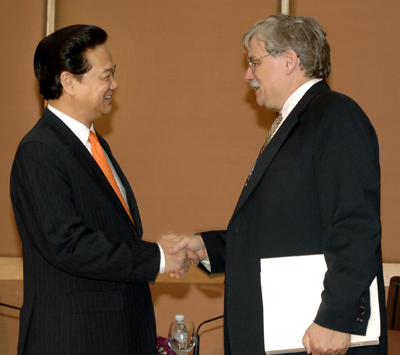 会见泰国总理阿披实时阮晋勇总理表示、越南一直重视并希望推进与泰国的多方面合作关系以及两国在湄公河委员会范围内的合作。两位总理一致认为、此次峰会及湄公河委员会所提出的湄公河流域发展若干战略已划定了各国未来合作方向,双方也鼓励缅甸和中国更深入地参与湄公河国际委员会。关于增加推动两国在经贸、投资方面的合作的措施,阮晋勇总理说越南随时欢迎和鼓励泰国投资商扩大对越南的合作,使两国经济合作关系日益切实 。两位总理也对连接从泰国木多成汗到越南的东-西走廊以促进双方贸易关系达成一致。