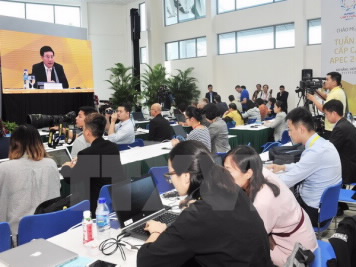 9日下午,越南政府副总理兼外交部长范平明与工贸部部长陈俊英共同主持新闻发布会,向媒体记者介绍APEC)第29次外交和贸易部部长级会议的结果。