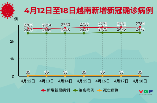 4月12日至18日:越南13各省市的10415人获接种包括:河内:199个,海防:603个,海阳:851个,北江:251个,广宁:2512个,奠边:324个,胡志明市:1438个,同塔:105个,平阳:35个,北宁:2291个(第二批);何静:1356个(第二批);高凭:345个(第二批);富安:105个(第二批)。